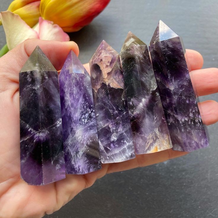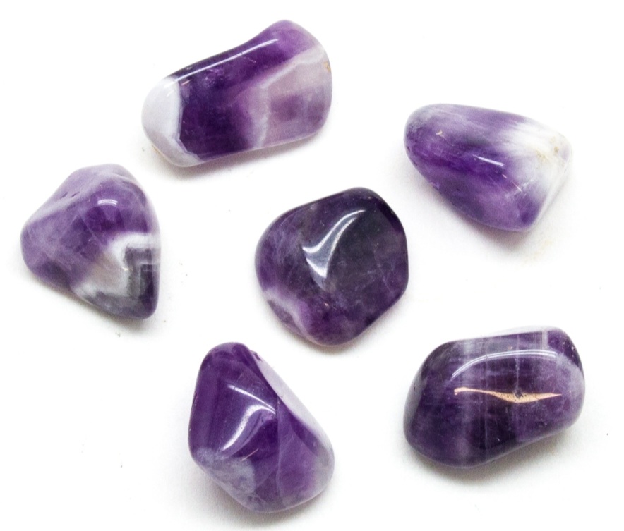 There are many shades of purple for amethyst, there are some that are deeply dark purple, but you can also get it where the purple is quite light, (the one above is so) if it is a wand, or sphere, etc, it’s like you can see all the way into the crystal, every little mark/strand is there for you to see. It is quite beautiful. There is also banded amethyst, which is a dark purple with bands of white in it. (It looks more like a mineral, because of this) The picture below is a few tumbled pieces of banded amethyst. The one underneath is a picture of a few Wands in a variety of the shades of purple that amethyst comes in.